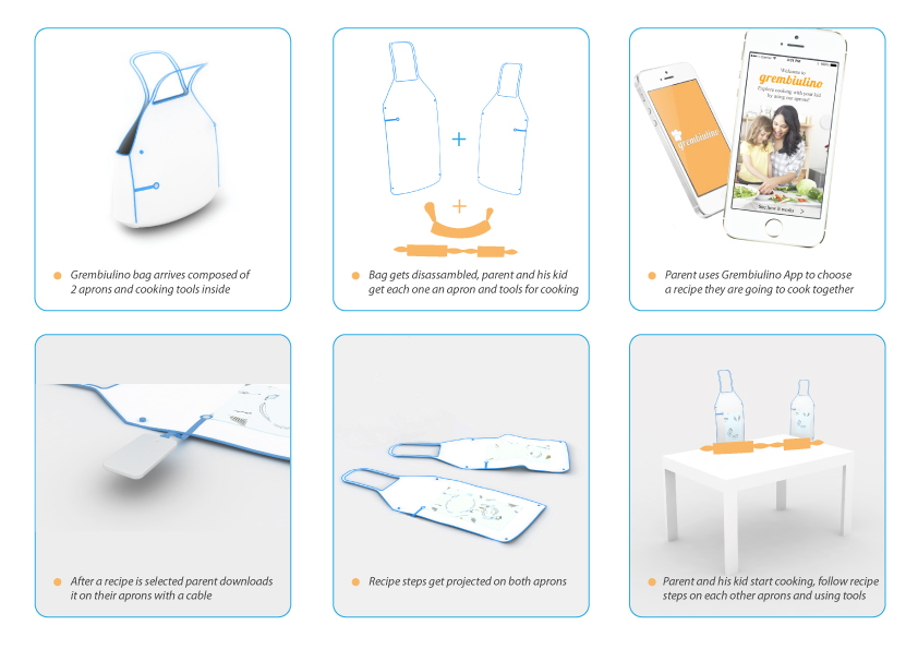 Recipe’s steps for the kid are projected on the apron of his parent (thanks to the LEDs incorporated in the apron). At the same time steps for the parent are shown on that of a kid. Grembiule for two would leave memories of a cooking experience for both of them.